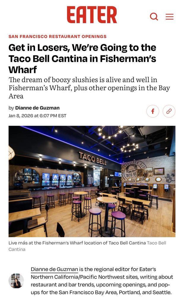 Taco Bell Cantinas are an operating subset of Taco Bell restaurants, blending the traditional fast-food model with a more upscale and urban vibe, and offering a more diverse menu and alcoholic beverages. With the success of several Cantinas in Northern California, Diversified Restaurant Group (DRG), Taco Bell’s largest franchisee, set its sights on expanding the urban concept to a recently-renovated area in Fisherman’s Wharf.